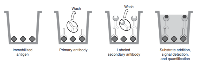 The following protocol is an example of indirect elisa. First, an unlabelled primary antibody binds specifically to the antigen.